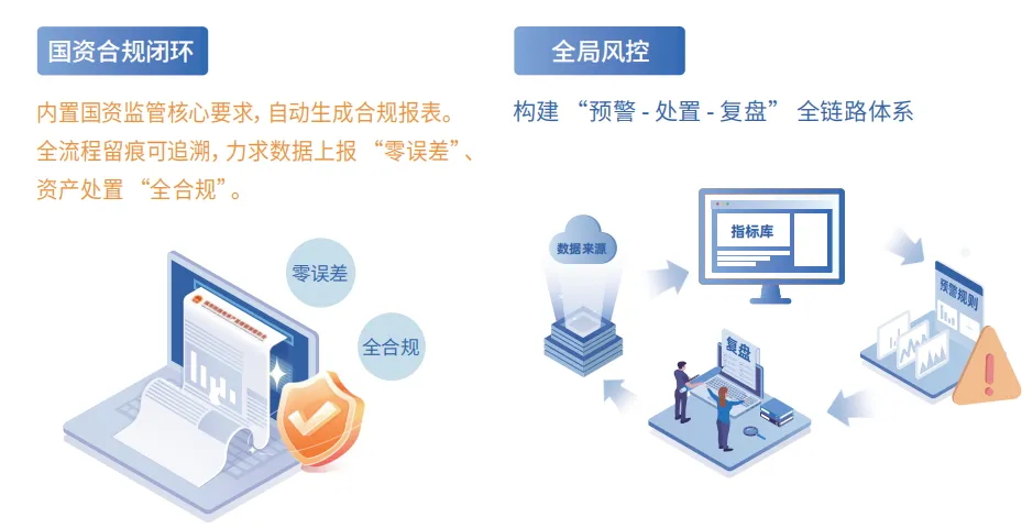 合規與風控是資產管理的底線。方案以筑牢資產防線為目標,構建全局風控體系。內置國資監管核心要求,能自動生成合規報表,全流程留痕可追溯,力求做到資產上 “零誤差”、資產處置 “全合規”。同時,構建 “預警 - 處置 - 復盤” 全鏈路體系,為商業地產資產安全保駕護航,讓企業在合規的軌道上穩健運營。