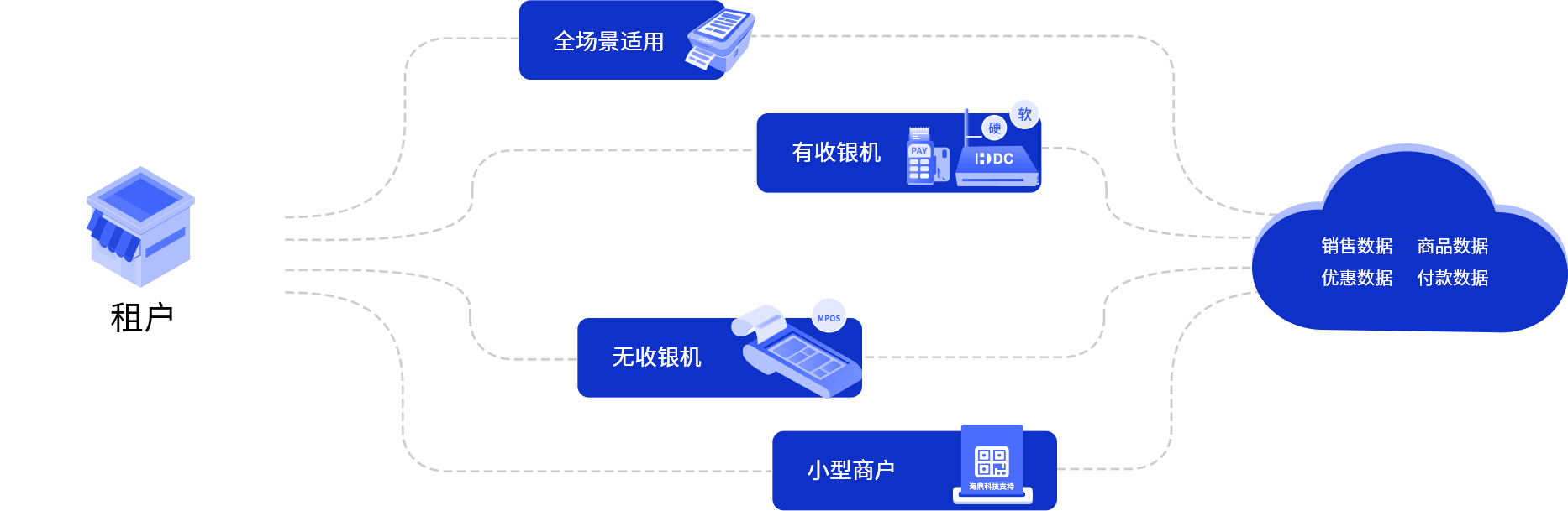首先通過對智能POS + 海鼎數據通(軟件/硬件) + 支付碼 + 移動數據上報 + 數據接口等多樣化數據采集方式的靈活結合,實現多業態及復雜業務場景的銷售數據全面采集。其次通過對數據質量、共享、資產及安全管理實現數據有效治理,從而實現商戶銷售監控、會員體系完善、商業職能分析電子化及金融服務數據支撐。